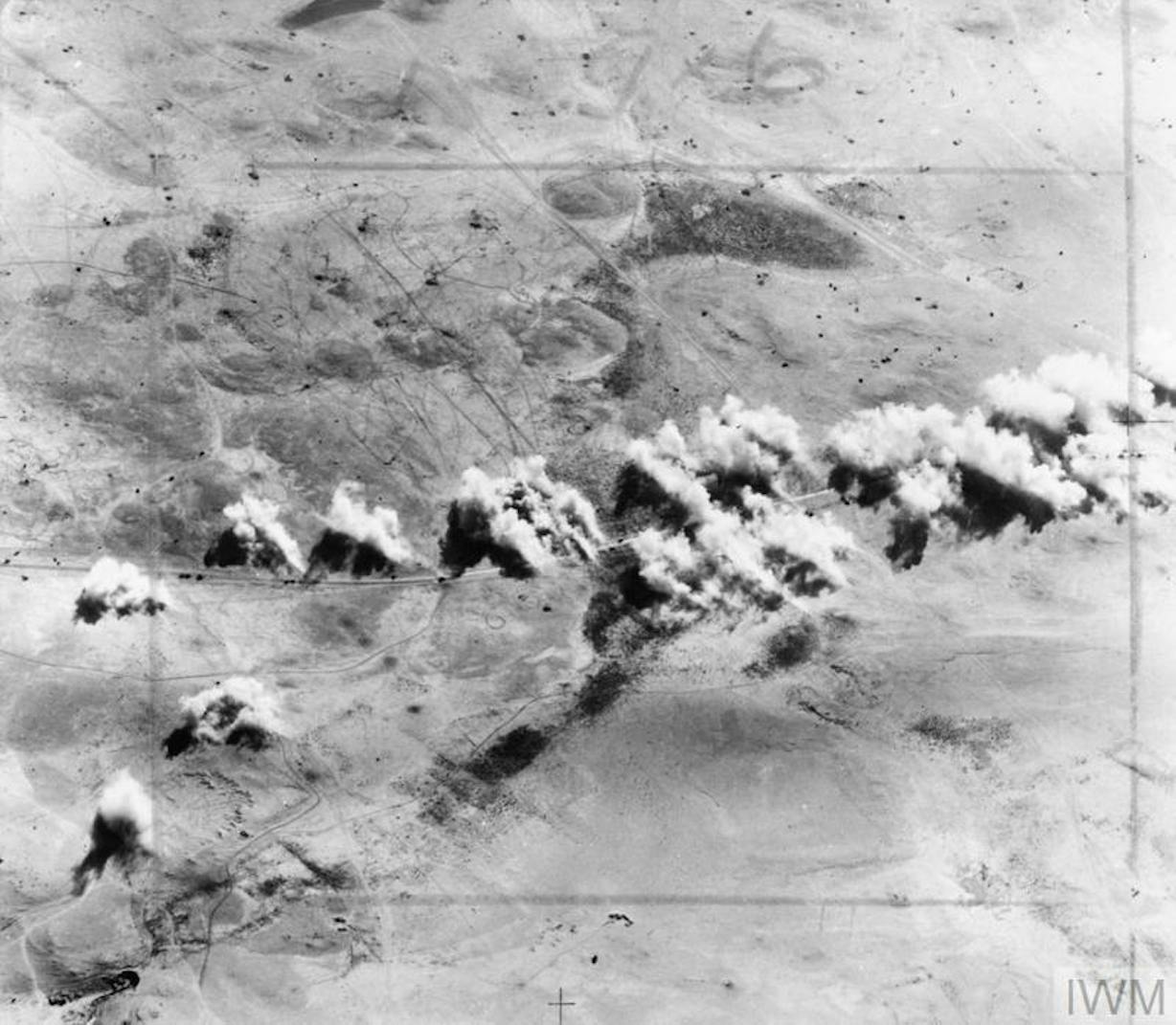A salvo of bombs from Martin Baltimore of No. 21 Squadron SAAF explodes on enemy transport on the road between el Daba and Fuka, Egypt, at the start of the enemy’s withdrawal from the Battle of El Alamein. © IWM (CM 3842)