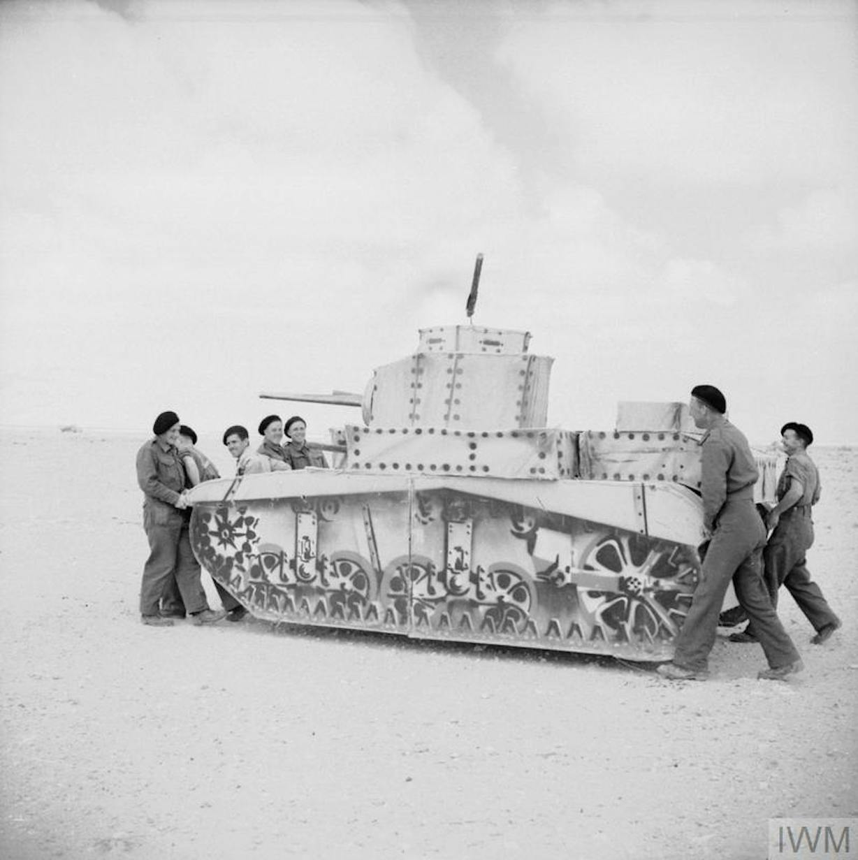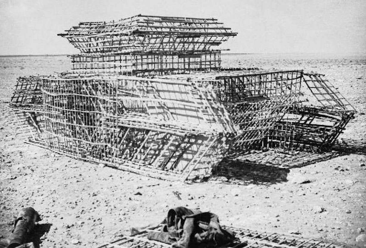 Photograph of the framework of a dummy tank under construction at the Middle East School of Camouflage in the Western Desert, 1942. Photo by Captain Gerald Leet. Chiswick Chap / Wikimedia Commons / Public Domain.