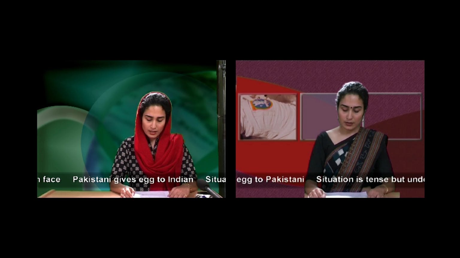 The News by Bani Abidi, a short film from 2001, is a staged, simultaneous telecast. There are two presenters – one Pakistani, one Indian – and their voices overlap as they present in parallel. Both characters are played by Abidi, their national identity denoted by language and dress. One speaks the Persianised Urdu of the official Pakistani state, the other the Sanskritised Hindi of the Indian. They deliver the same address, albeit in varying register and tone. It’s breaking news: a hen has laid an egg right on the border between the two countries. The film is a piece of satire, riffing off on an oft-repeated joke. Now, ask the telecasters in their verbose, stylised manner: to whom does the egg belong?