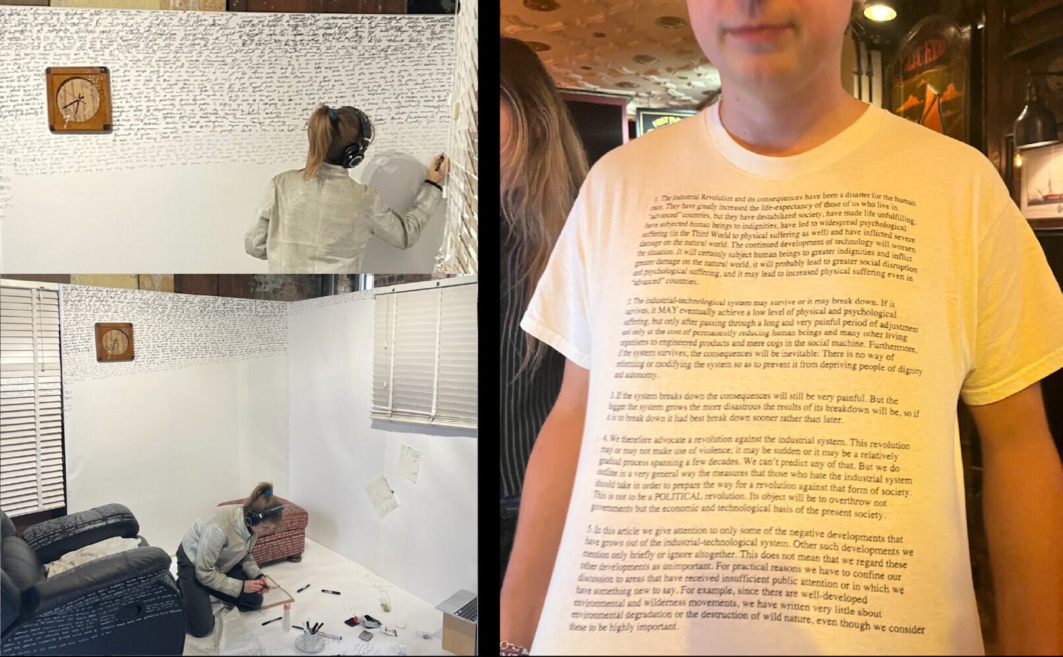Leftist memes became notorious for illegible dense paragraph blocks that vainly attempt to deconstruct capitalism in a single deep-fried jpeg to the point where the self-referential and self-deprecating ‘leftist meme’ itself emerged. However, this phenomenon is not exclusive to the left. Trump’s tweets (technically his Truth Social posts), for example, typically balloon into the length of a short op-ed. Recently, I met a guy called Tom in a London pub rocking a Ted Kaczynski manifesto T-shirt. The same day I passed by an art performance where an artist, in a flow state, was sharpie-scrawling little words onto every surface of a room. Two days later, a friend served me the ever-dreaded ‘just had to get this off my chest’ blue iMessage screen-sized bricked-up wall of text.