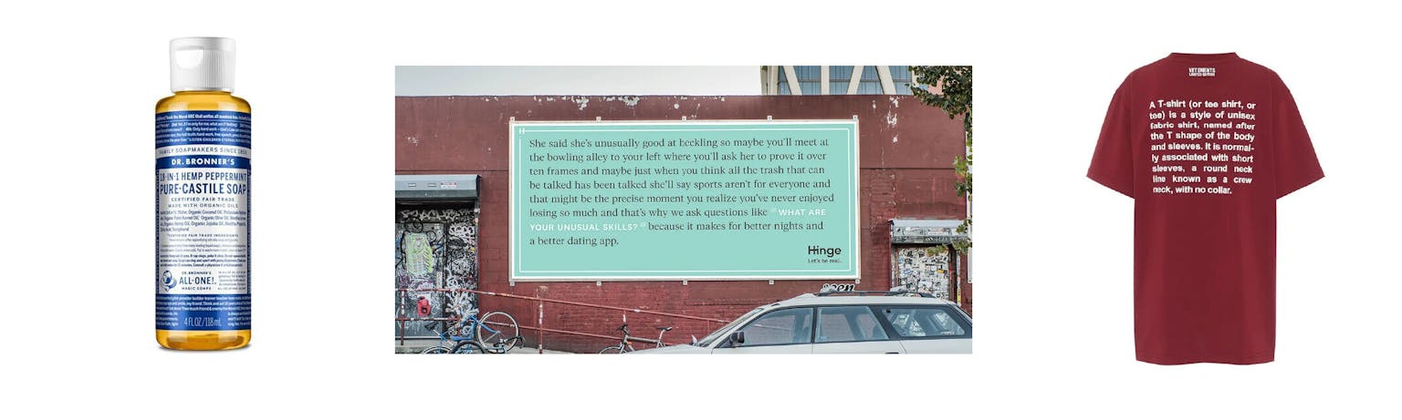Such glaring futility tips the scales towards the form of the wall of text. As an image, or even a vibe, blocks of text are usually afforded more sympathy in popular culture. The negative association of an imposed reading exercise like Google’s Terms & Conditions’s nine-hundredth update is almost the opposite of how we, at least the meme-literate, feel about ‘copypastas’.4 Copypastas turned textual overload into a participatory joke where the only punchline was its form. The copypasta trolls set them up as pranks that are not supposed to be read, but I bet they loved writing them just as much as the Red Guard Maoists loved writing their dazibaos. The wall of text is also known for attributing cultural coolness, which brands love to exploit when they want to hit the ‘seem smart’ KPI – as can be seen, for example, in the packaging design and advertising of Hinge, Vetements, or Dr Bronner’s Magic Soap. After all there’s a reason Tom was proudly flexing his Ted Kaczynski manifesto T-shirt. Text blocks hold gravitas that some conflate with status. And when people do stop and read, it’s a rare intimate act of attention.