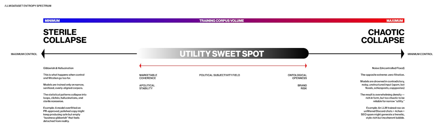 Under the guise of legal and licensing concerns, AI companies are abandoning open web scraping in favor of private, licensed corpora purchased through opaque contracts with publishers and data brokers. This is where they face a dilemma: feed your LLM too little and it becomes too sterile and hallucinatory, feed it too much and you start losing control. They’re boxed in a Sterile<>Chaotic spectrum; where utility is a subjective sweet spot somewhere in the middle.