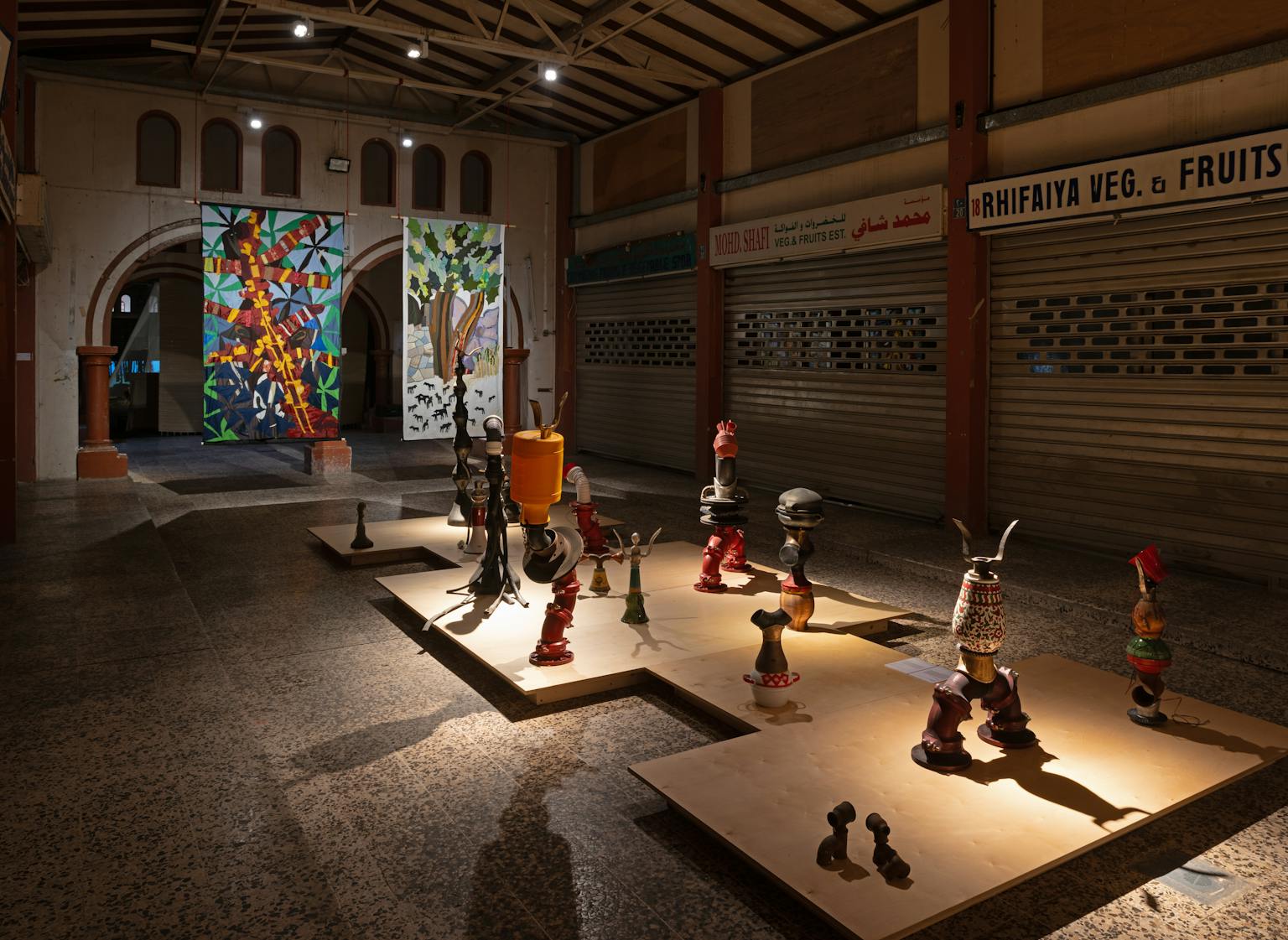 Sakiya, Water Witnesses (2020–ongoing), metal pipe fittings, bent pickaxes, clay vessels, found objects. Installation view: Sharjah Biennial 16, Old Jubail Vegetable Market, Sharjah, 2025. Courtesy of Sharjah Art Foundation. Photo: Shanavas Jamaluddin.