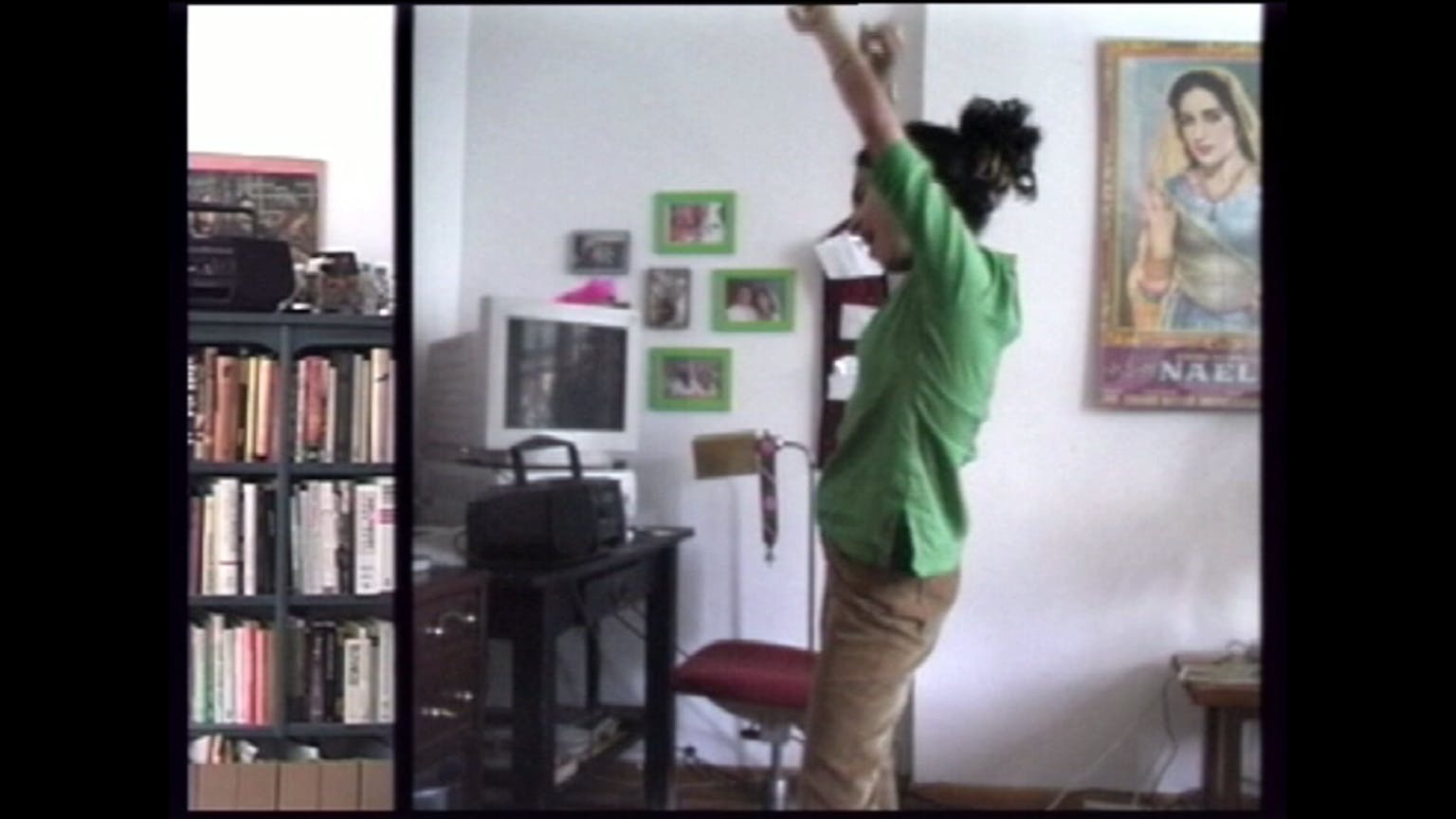 Addressing the role of music in the creation of patriotic sentiment, Anthems shows a split screen image of two young women (played by the artist) dancing to popular Indian and Pakistani songs. Their activity is private and they are (seemingly) unaware of each other.