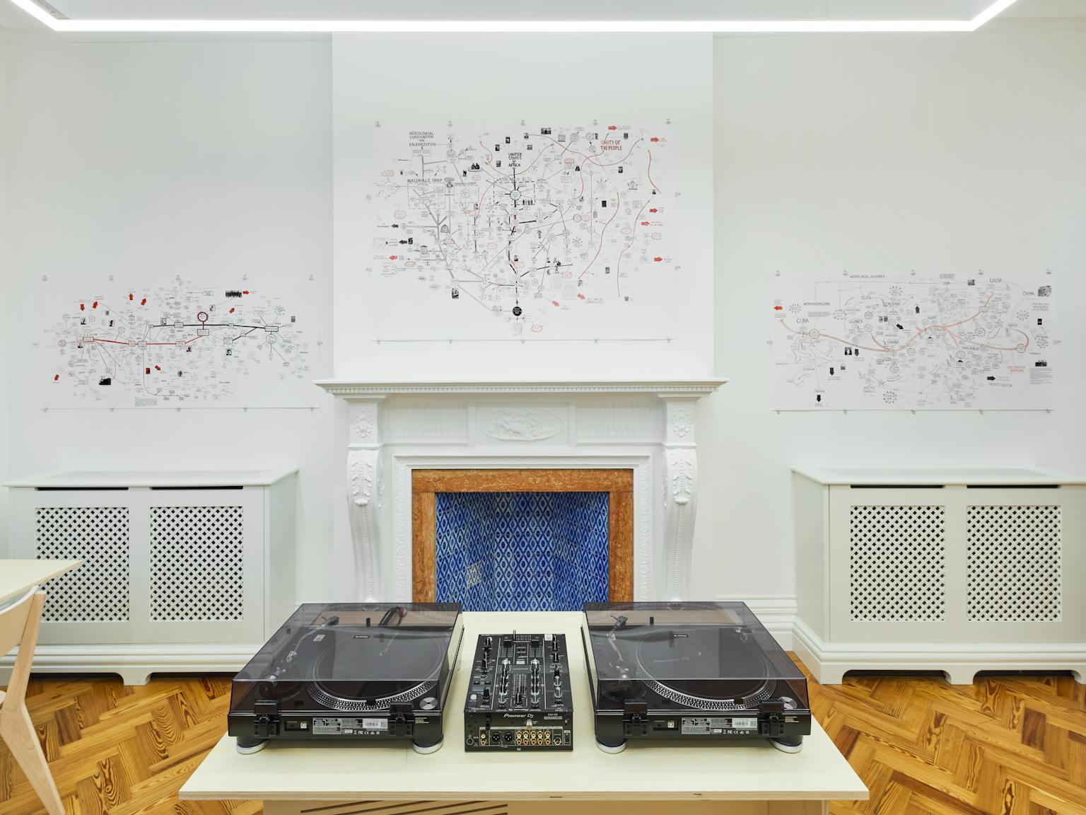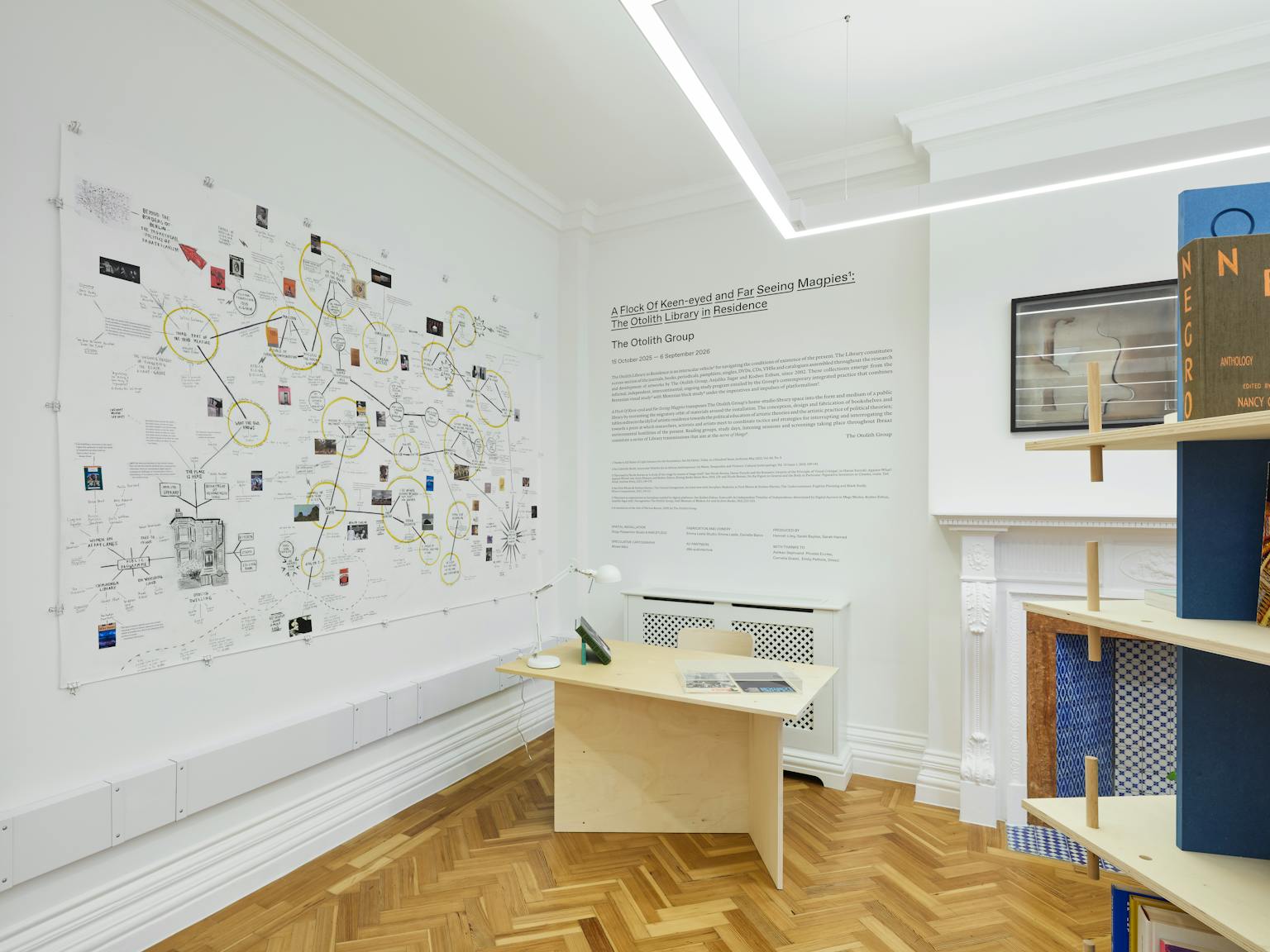 The Otolith Library-in-Residence transforms research into public encounter. For over 20 years, artists Kodwo Eshun and Anjalika Sagar have gathered books, journals, records, and films – the intellectual materials that fuel their art-making. Now these collections migrate from their home studio to public space as an invitation for collective study. Reading groups, screenings, and listening sessions in the Library, Majlis, and Minassa at Ibraaz, become points of gathering and convening. Researchers, activists, and artists gather to develop new strategies for confronting our environmental and social crises. A Flock of Keen-eyed and Far-Seeing Magpies becomes a transmission point – broadcasting alternative frequencies of knowledge, resistance, and possibility into the present moment.