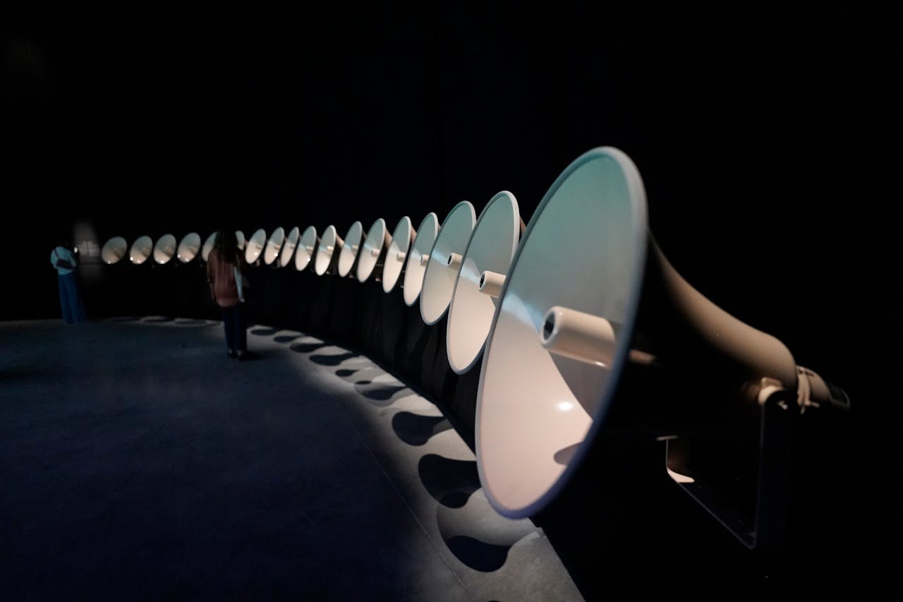It brings together historical and contemporary calls from different geographies, amplified through horn speakers synonymous with those perched on the minarets of mosques. Played simultaneously, each speaker softly emits a different adhan recording, inviting the audience to lean in and listen closely. At prayer times throughout the day, the volume increases to become clearly audible in the room, creating a congregation of calls to prayer.