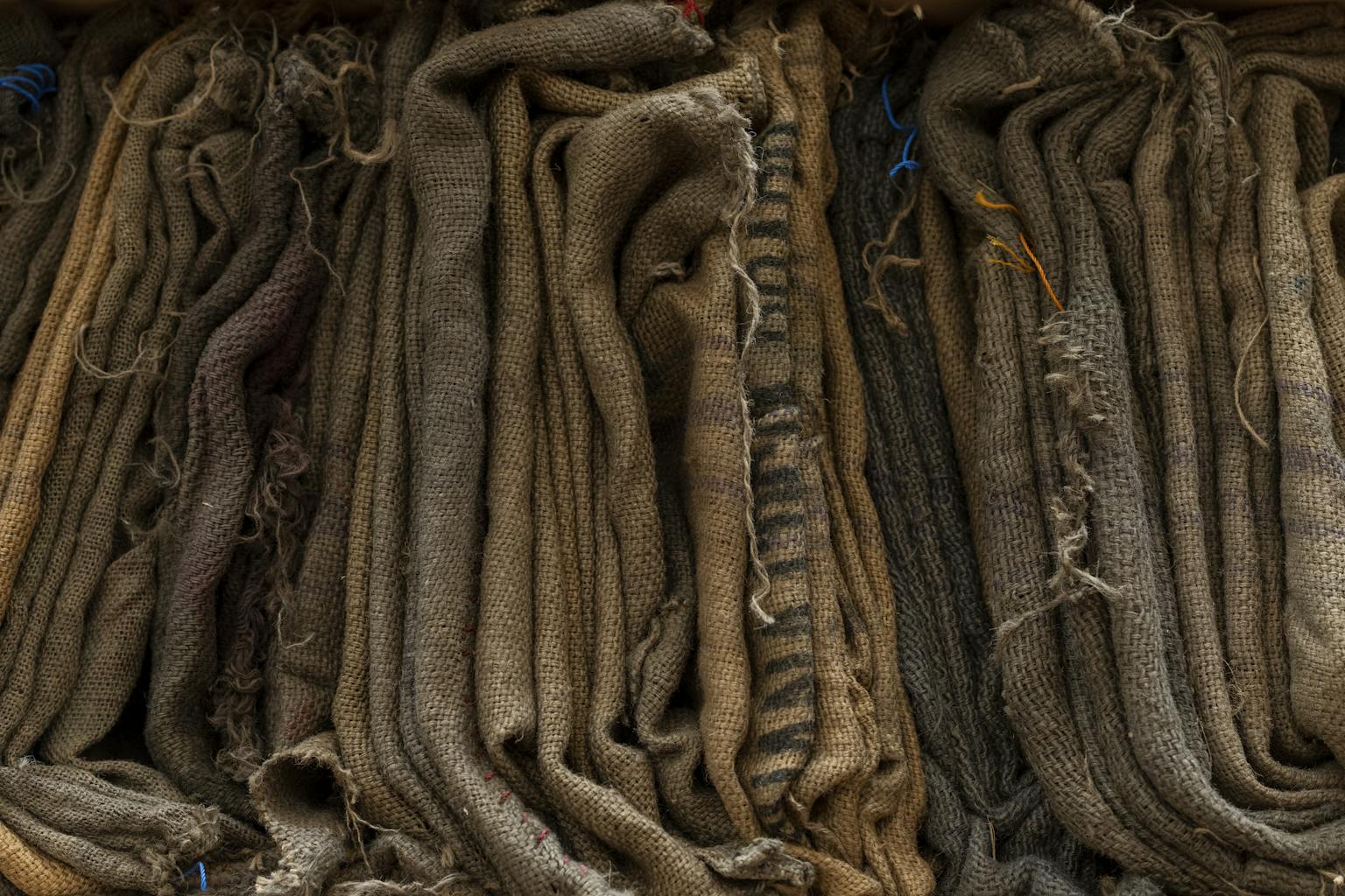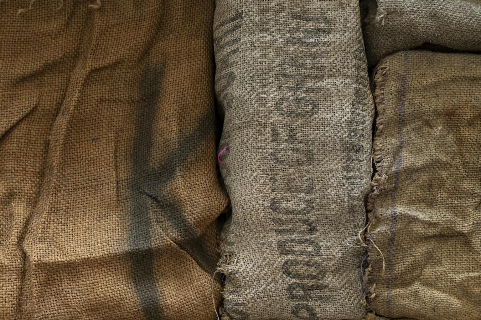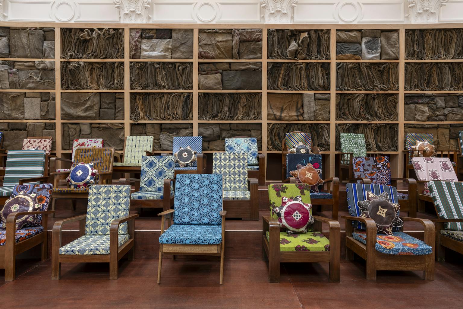 Ceremonially arranged around the room are 75 chairs, each drawn from households across Ghana. Once signifiers of authority within patriarchal structures, they are here reassembled into a parliament that privileges presence and dialogue over power. Cushions – made from fabrics and leathers sourced at the local market where Mahama’s studio is based – soften and animate the dark woods, while jute sacks fill the shelves around the Majlis, invoking the toil of trade, which underpins economic power through the ages.